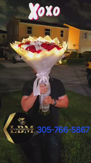 Encircled by a sheer tulle of LED lights that enhances its beauty, the bouquet features an elegant white ribbon with golden edges laid across the roses, perfect for a personalized message in golden script (up to four words), finished with a sophisticated decorative bow.