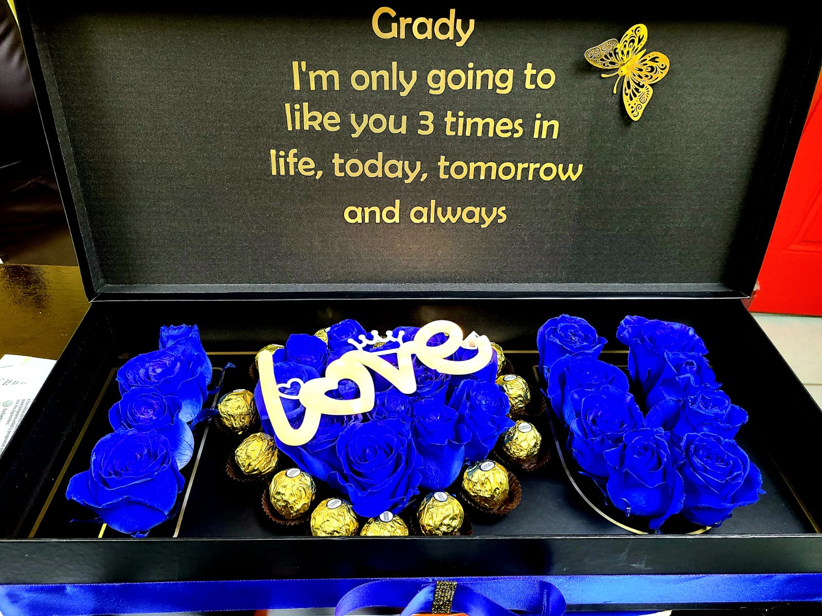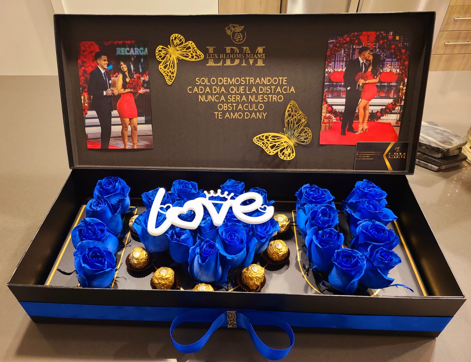 An elegant black box holds majestic Ecuadorian blue roses, paired with delicate Ferrero Rocher chocolates and a luminous "love" LED sign crowned with a symbol of royalty.